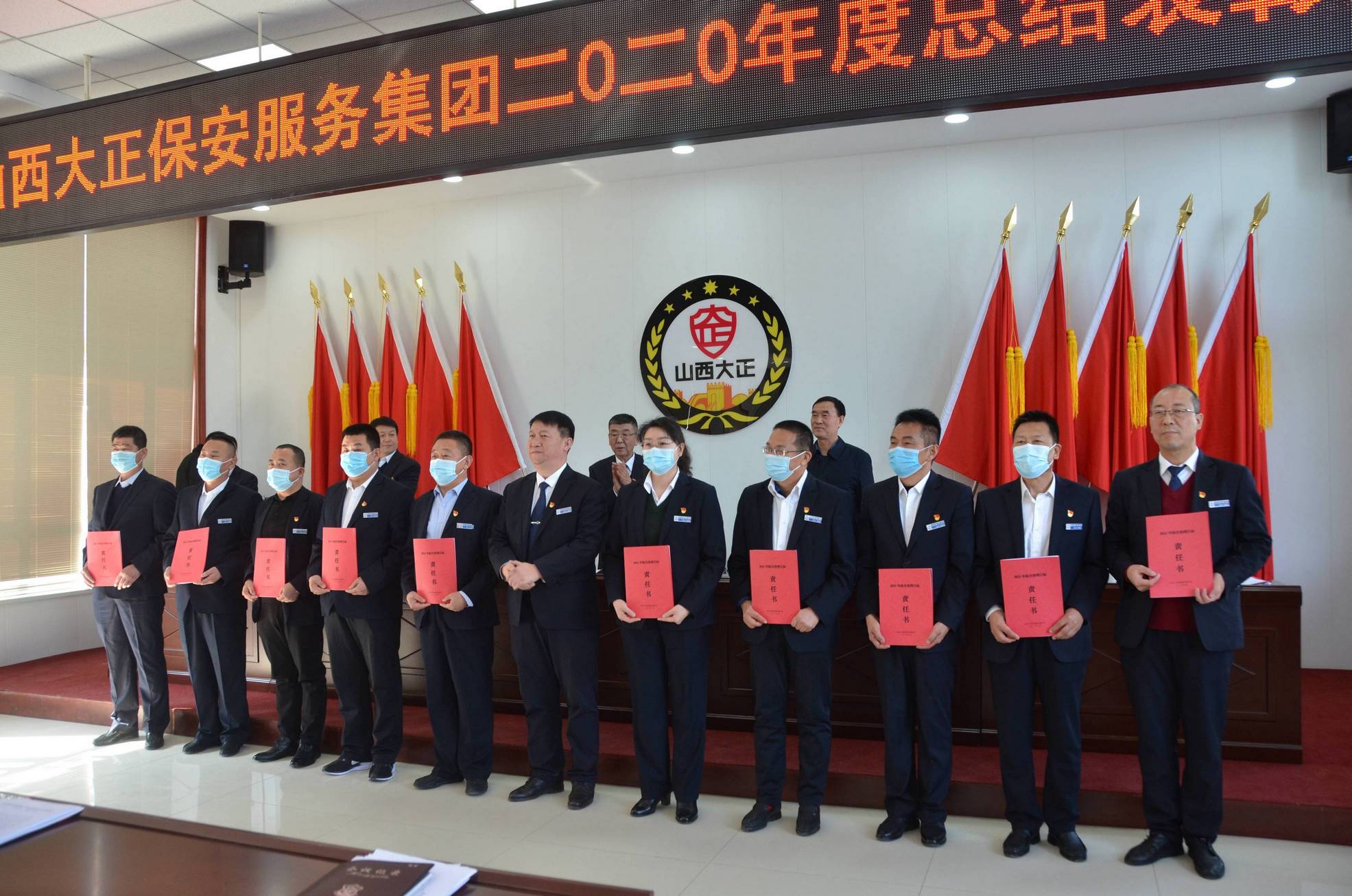 會(huì)上,黨委書記、董事長(zhǎng)張躍生向公司各子公司、各部門、各黨支部負(fù)責(zé)人頒發(fā)了黨建目標(biāo)責(zé)任書、黨風(fēng)廉潔目標(biāo)責(zé)任書,黨委副書記、總經(jīng)理趙培宏向公司各子公司、各部門負(fù)責(zé)人頒發(fā)綜合治理目標(biāo)責(zé)任書、安全生產(chǎn)目標(biāo)責(zé)任書。大會(huì)在《大正保安之歌》歌聲中圓滿落幕。