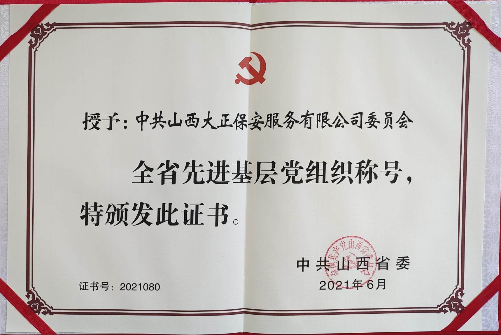 6月22日,在即將迎來中國共產(chǎn)黨百年華誕之際,山西省“兩優(yōu)一先”表彰大會在太原隆重召開。會上,中共山西大正保安服務(wù)集團(tuán)有限公司委員會被中共山西省委授予“全省先進(jìn)基層黨組織”榮譽(yù)稱號。會議以電視電話會議形式召開,集團(tuán)公司黨委副書記、副總經(jīng)理陳志平代表集團(tuán)公司黨委在忻州分會場參會并領(lǐng)取獎牌及榮譽(yù)證書。