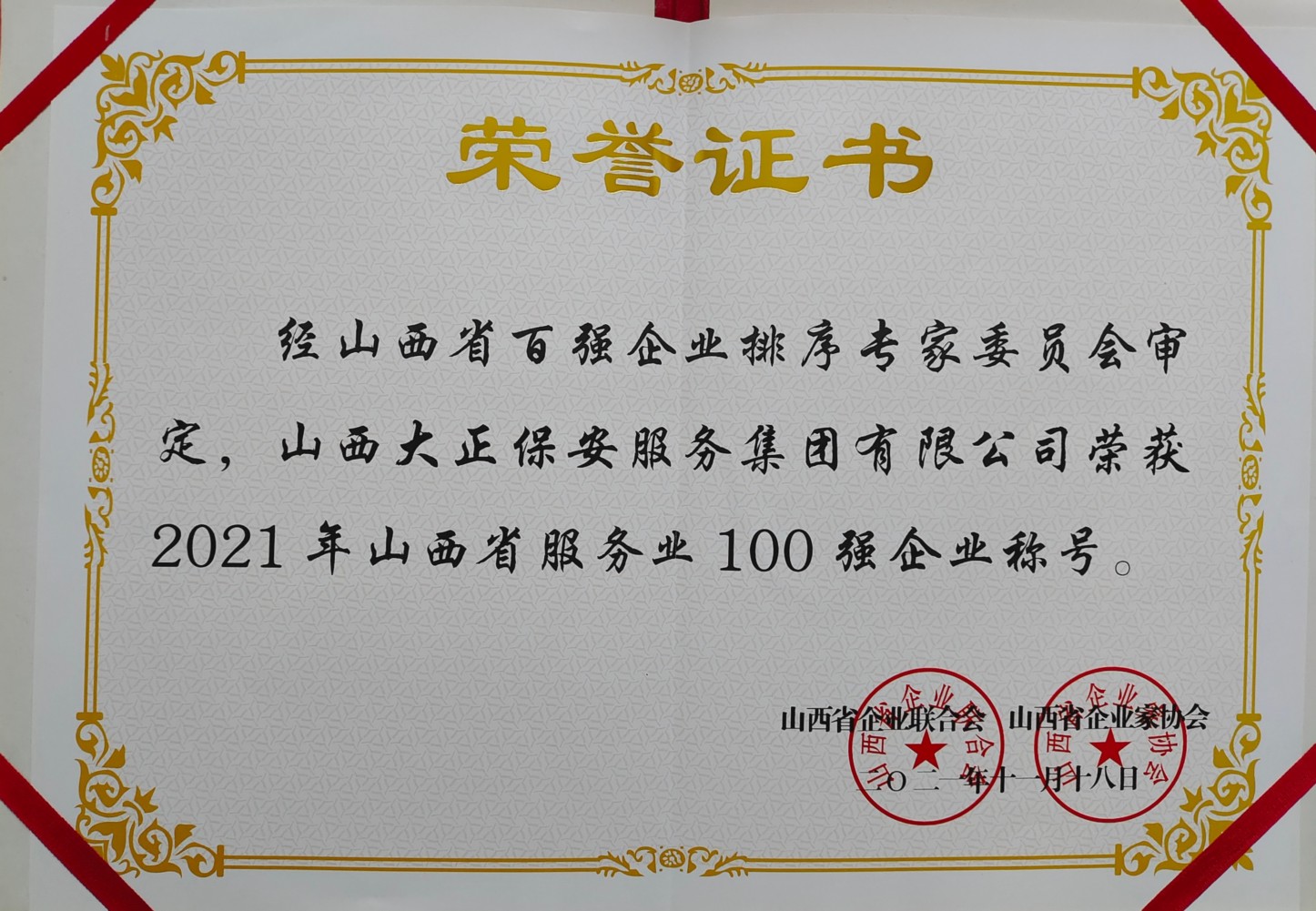 2021年11月18日,以“貫徹新理念、奮進(jìn)新征程,努力推進(jìn)山西大企業(yè)高質(zhì)量”為主題的山西省企業(yè)聯(lián)合會(huì)、山西省企業(yè)家協(xié)會(huì)第七屆會(huì)員代表大會(huì)暨2021山西企業(yè)100強(qiáng)發(fā)布會(huì)在太原召開。山西大正保安服務(wù)集團(tuán)有限公司黨委副書記、總經(jīng)理趙培宏,黨委副書記、副總經(jīng)理陳志平應(yīng)邀前往參會(huì)。