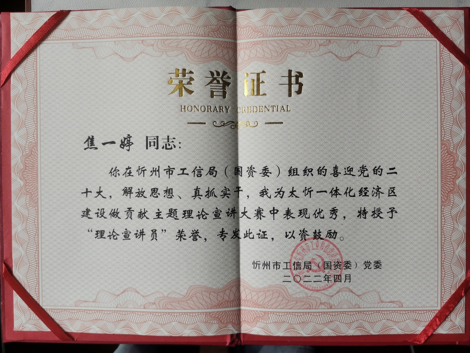 3月21日,以喜迎黨的二十大,解放思想、真抓實干,我為太忻一體化經(jīng)濟區(qū)建設做貢獻為主題的“忻州市第二屆理論宣講大賽”中,我公司參賽人員焦一婷緊扣演講主題,以“忻州市創(chuàng)建文明城市”為抓手,充分結(jié)合自己在創(chuàng)建文明城市中的所做、所見、所聞,就作為一名國企員工如何在工作中解放思想,真抓實干展開演講,用實實在在發(fā)生在身邊的志愿實例說明問題,通俗易懂,極富感染力。大賽組委會結(jié)合當前省內(nèi)疫情防控實際,開展線下比賽組織參賽選手以錄制視頻的形式參賽,最終經(jīng)過忻州市工信局(國資委)黨委的評比,參賽人員焦一婷榮獲“理論宣講員”稱號,并獲得獎品《人世間》、《創(chuàng)業(yè)史》書籍兩套。