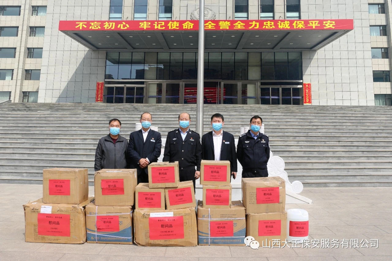3月31日,山西大正保安服務(wù)(集團(tuán))有限公司黨委委員、副總經(jīng)理趙培宏、副總經(jīng)理王明生領(lǐng)導(dǎo)一行,專程來(lái)到市公安局,捐贈(zèng)了醫(yī)用口罩12000、防護(hù)服200套、護(hù)目鏡500個(gè)、消毒液80㎏、醫(yī)用酒精25㎏,表達(dá)公司和干部職工對(duì)公安民警疫情防控的支持;對(duì)警保同心、聯(lián)手抗疫的信心、決心;對(duì)廣大公安民警健康的關(guān)愛(ài)。忻州市公安局副局長(zhǎng)王雷接過(guò)物資后,代表市局對(duì)大正集團(tuán)公司的捐贈(zèng)表示感謝。