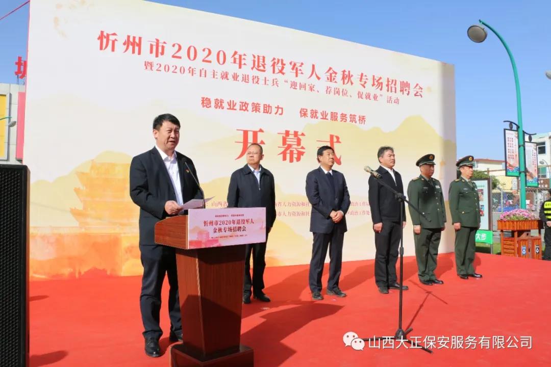 10月21日,由山西省退役軍人事務(wù)廳、山西省人力資源和社會(huì)保障廳、山西省軍區(qū)政治工作局主辦,忻州市退役軍人事務(wù)局、忻州市人力資源和社會(huì)保障局、山西省忻州軍分區(qū)承辦的忻州市2020年退役軍人金秋專(zhuān)場(chǎng)招聘會(huì)于忻州體育廣場(chǎng)舉行,活動(dòng)以“穩(wěn)就業(yè)政策助力,保就業(yè)服務(wù)筑橋”為主題。山西大正保安服務(wù)集團(tuán)有限公司總經(jīng)理趙培宏作為參會(huì)企業(yè)代表上臺(tái)發(fā)言,集團(tuán)公司人力資源中心工作人員在現(xiàn)場(chǎng)開(kāi)展招聘活動(dòng)。