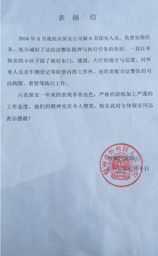 這封表揚(yáng)信既是忻府區(qū)法院對(duì)特勤支隊(duì)駐法院中隊(duì)日常工作的認(rèn)可,更是對(duì)我支隊(duì)工作的肯定。它極大的鼓舞了大家的工作熱情,增強(qiáng)了大家做好工作的信心,同時(shí)也給其它中隊(duì)做了一個(gè)表率作用。