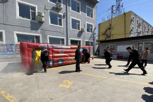 課后,億通公司院內(nèi)搭起了室外逃生氣模帳篷,帳篷內(nèi)放置煙霧器,模擬火災(zāi)現(xiàn)場。50余名職工口捂濕毛巾,依次進(jìn)入逃生帳篷內(nèi)摸黑逃出。通過實地演練,使員工更加直觀地體驗“火災(zāi)現(xiàn)場”,提高了員工的火場逃生自救能力。